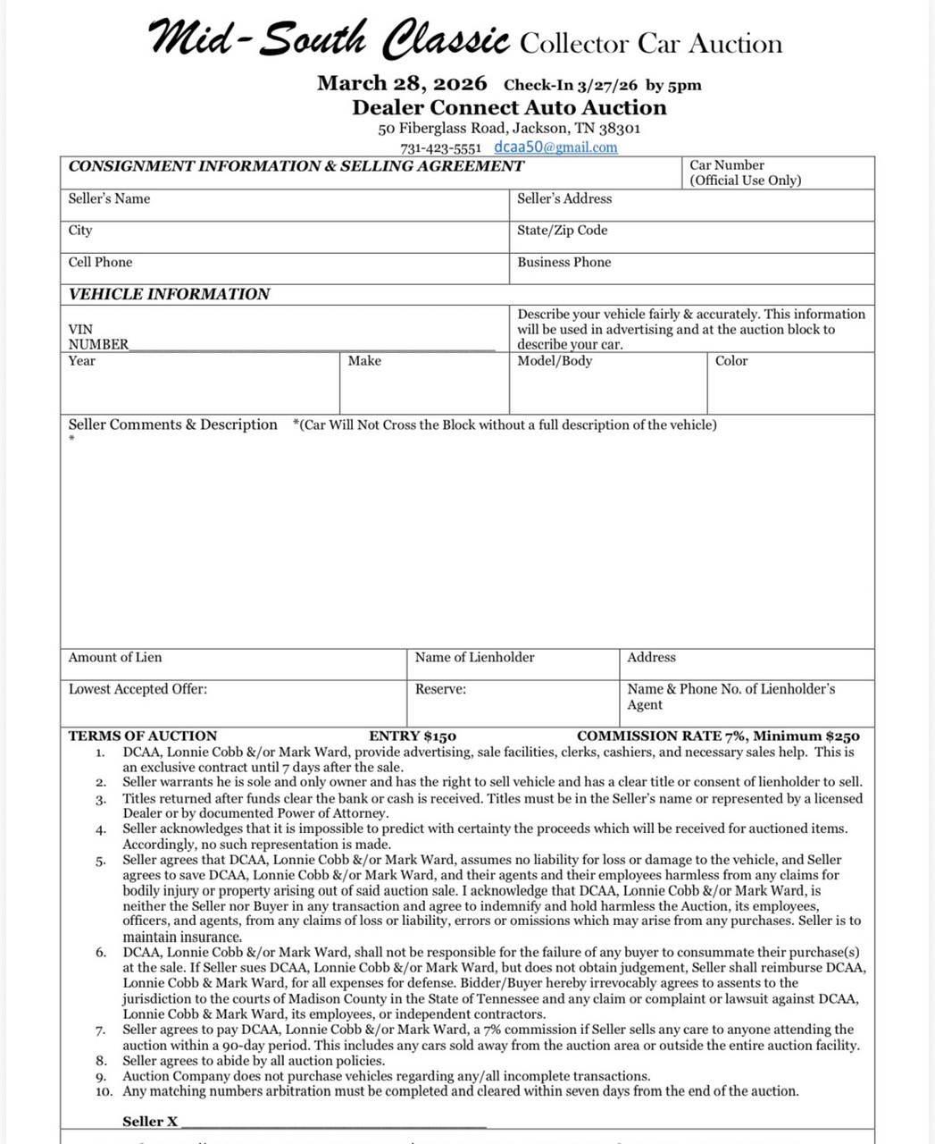 Transferable title to be submitted at time of registration at auction site. Sale numbers are assigned on a first come, first served basis upon payment of entry fee. Title must be in consignor's name unless you are a dealer or authorized agent.